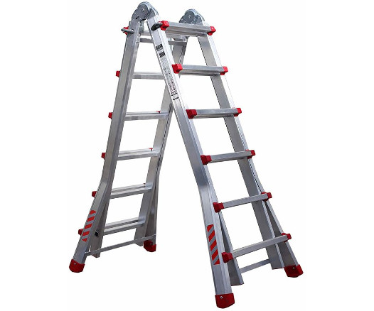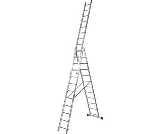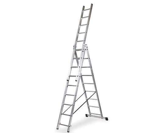 Alquiler de robusta escalera de 3 tramos y 14 peldaños con una altura máxima de 10 metros. Altura de trabajo mano extendida. Por su poco peso es fácil y cómoda de transportar, ideal para reparaciones en altura, trabajos de desatasco de canalones, pintura de facahadas, trabajos en cubiertas, reparación y colocación de lamparas…